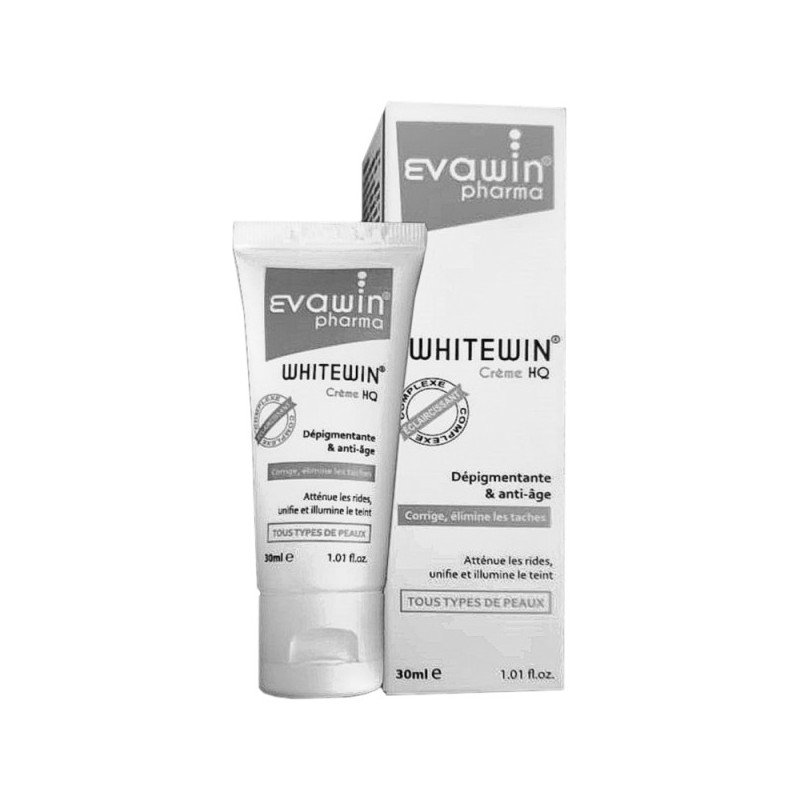 Crème éclaircissante (Whitewin) contenant de l’Hydroquinone (HQ), un actif dépigmentant puissant, souvent soumis à réglementation. Format 30ml.