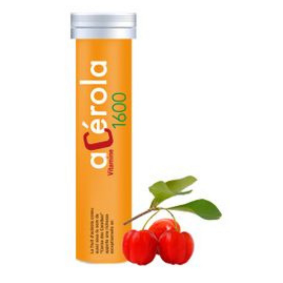 Complément Fenioux Acérola 1600, riche en vitamine C naturelle. Tube de 14 comprimés à croquer ou sucer.