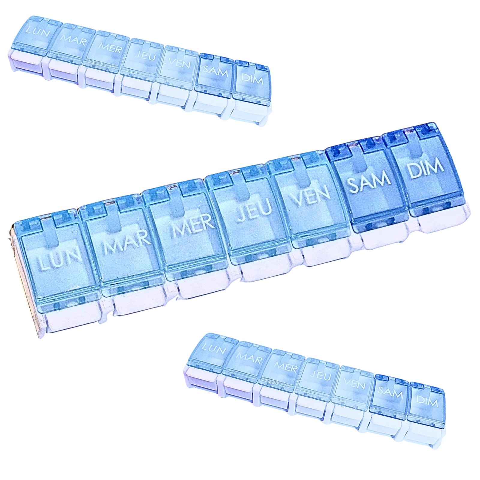 Boîte de rangement pour organiser la prise de médicaments par jour et par semaine. UTILISATION : Remplir les compartiments selon la prescription. COMPOSITION : Plastique. PRÉCAUTIONS : Garder hors de portée des enfants (risque d’ingestion).